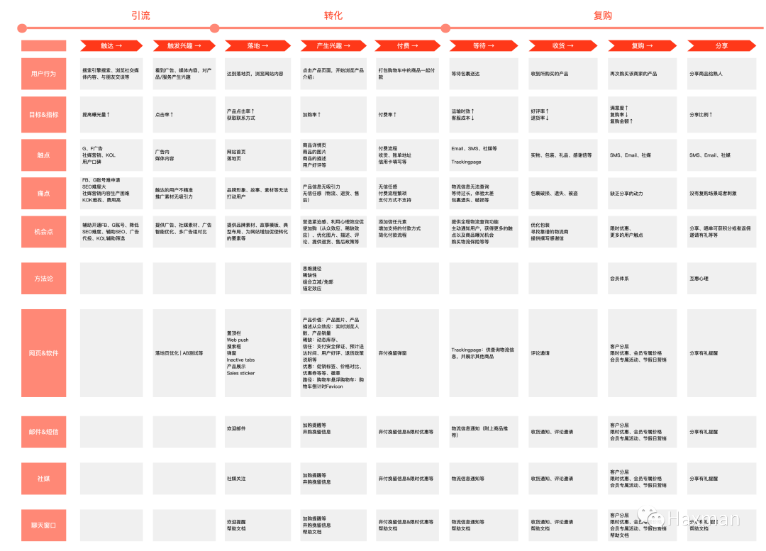 以上是根据用户在网站上的旅程梳理而成的用户旅程地图,该图涵括了用户与商家交互的过程中的用户痛点及机会点,并在触达用户的各种方式上提供一些常见的解决思路。这幅图可以让我们从总体把用户的路径及建站工具需要解决的问题。
