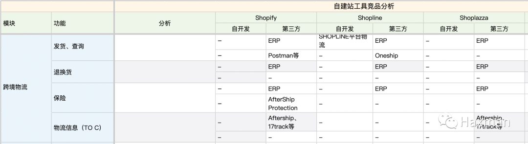 发货、查询、退换货、保险:Shopify有自建的物流(合作商家),但在中国区域不可用;Shopline有自建的物流渠道(胜出);但用ERP可以很容易地解决发货、运输的问题,所以在这一点上,能力差距不大→ →